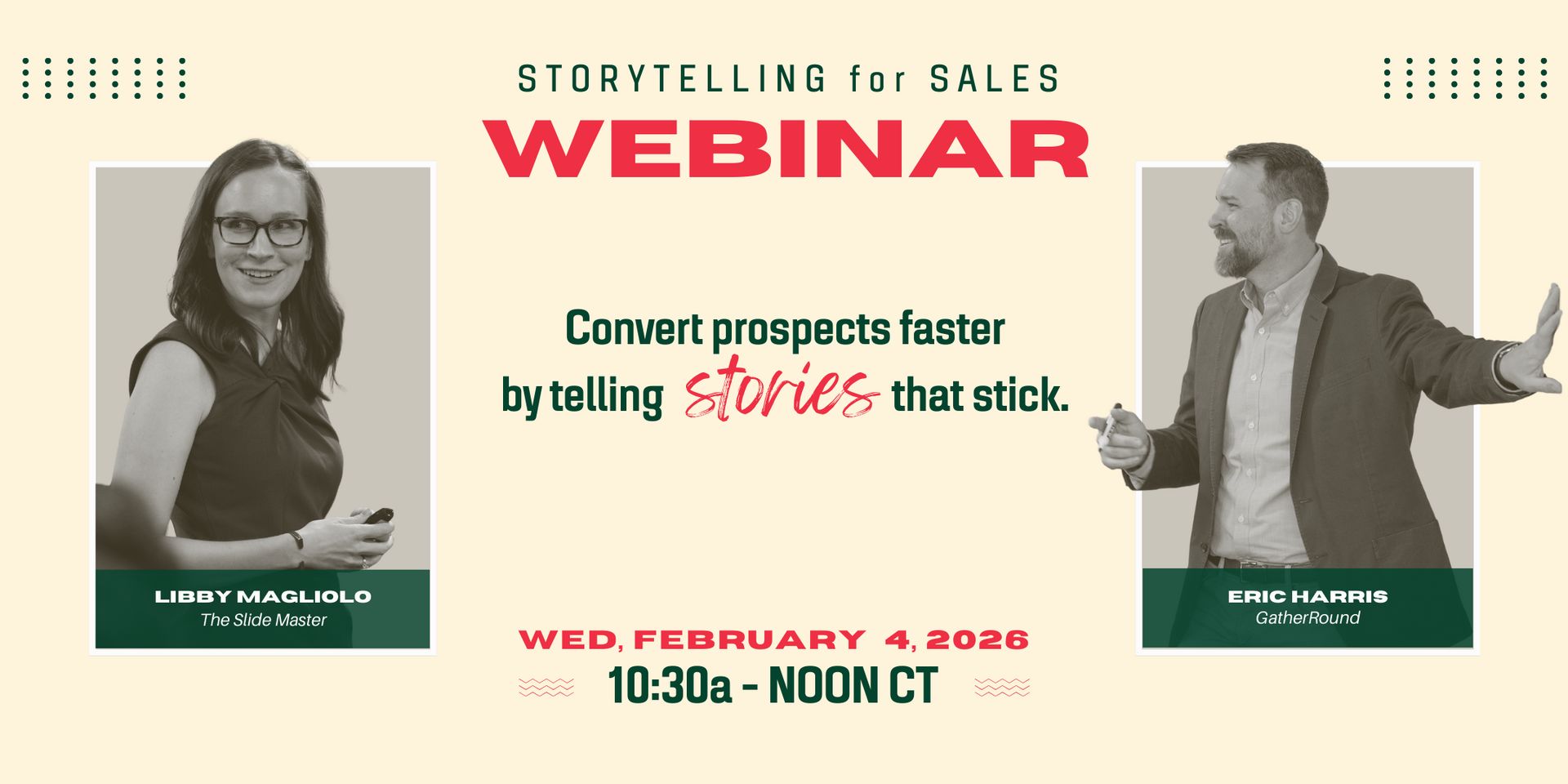 On February 4th, Libby and I are hosting Storytelling for Sales: Convert prospects faster by telling stories that stick. If you want to replace feature slurry with conversations that move people, this session will shift the way you show up in every pitch.